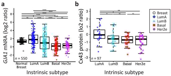 The GJA1 expression level is more variable in breast tumor than in normal tissue and varies with subtype. (a) The GJA1 mRNA level in normal breast tissue and in each tumor intrinsic subtype. (b) The Cx43 protein level in each intrinsic subtype. In the legend, “Breast” indicates adjacent normal breast tissue. All data are from the TCGA dataset. p value: * <0.05; ** <0.01; *** <0.001; NS Not statistically significant.