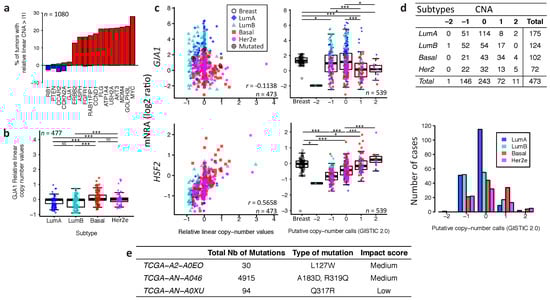 Moreover, tumors with GJA1 amplification did not show an increase in expression while only deep deletions reduced expression (−2 in called copy number, as shown in Figure 3c). Most luminal tumors with the highest expression of GJA1 were found to have either a normal copy number or single deletion (Figure 3b–d). Moreover, in tumors with a GJA1 gain or amplification, a slight but significant decrease in expression, rather than an increase, could be observed compared to normal tissues (Figure 3c). GJA1 mRNA also weakly negatively correlated with DNA copy number (Figure 3c), suggesting that Cx43 over-expression in breast cancer is not driven by DNA amplification. To validate our procedure, we used the HSF2 gene, a close neighbor of GJA1 on chr6q22 which shares similar copy number in 99% of TCGA’s breast cancer cases. In contrast to what was observed for GJA1, HSF2 mRNA was positively correlated with the copy number of its own gene (Figure 3c). Moreover, somatic point mutation data showed that, in the TCGA cohort, only three breast cancer patients out of 977 harbored at least one GJA1 mutation, accounting for 0.31% of the tumors (Figure 3e). Only one tumor with an extremely high number of total mutations (TCGA-AN-A046) was found to have both a GJA1 mutation and a slightly higher expression of the gene (2.76) compared to normal range (−1.01 to 2.20) (Figure 3c,e). Together, these results argue that loss or amplification of the GJA1 gene likely does not dictate mRNA and protein dysregulation in breast cancer.