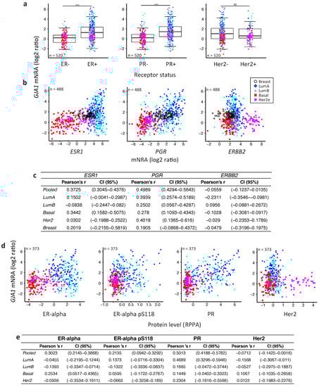 Stronger correlations between PGR mRNA and protein levels and GJA1 mRNA levels were observed, not only in unstratified (pooled) analysis, but also in individual subtypes within most datasets (Figure 4b–e and Figure A1b,c). This association was stronger in cancer samples than in normal breast tissues in all datasets for which normal tissues were available. Similar to ER, total PR protein was well correlated with PGR mRNA (Pearson’ rho = 0.8593 and Spearman’s rho = 0.8723).