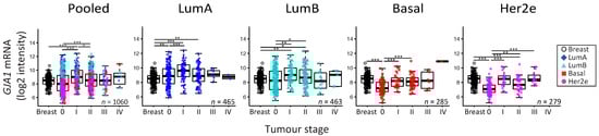 To reconcile evidence supporting both tumor-suppressive and -promoting roles, it has been suggested that Cx43 function could depend on tissue type or evolve with tumor stage []. We therefore investigated whether GJA1 expression in primary breast tumor changed with stage and grade at the mRNA level in breast cancer. Since grade/stage are strongly associated with subtype, we first stratified our cohorts by intrinsic subtype. We used the Curtis dataset, as GJA1 expression was available for invasive tumors (stages 0 to IV) and “normal” adjacent tissue for numerous samples. A significant dysregulation of GJA1 expression occurred at the early stages in all breast cancer subtypes, although both over-expression and downregulation could be observed (Figure 5 and Figure A5). Most of the GJA1 over-expressing luminal tumors were found to be of low stage (0–II). However, a reduction was observed in early stage basal-like and Her2e tumors (Figure 5 and Figure A5). A significant increase in GJA1 was also observed in the invasive stage I compared with stage 0 in all subtypes (Figure 5).