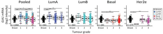 We then investigated whether or not the expression of GJA1 could be linked to tumors’ grade. Our analysis revealed that GJA1 mRNA expression was significantly decreased with grade when all tumors were pooled, but not when they were stratified by intrinsic subtype (Figure 6 and Figure A6). A significant decrease in GJA1 with grades in LumB tumors could be observed only in the Vanvliet’s dataset but not in other datasets analyzed (Figure 6 and Figure A6).