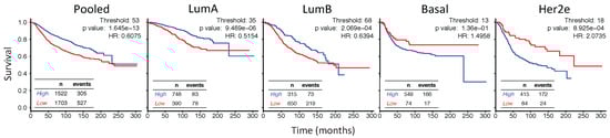 Since the aggregation of several datasets in BreastMark and KMPlotter platforms could lead to artifacts in survival analysis, we went further by performing our own survival analysis for each subtypes for either aggregated (Figure 7) or individual datasets (Figure A9 and Figure A12) following the determination of the best cutoff either by the receiver operating characteristic (ROC) curve (Figure A8a–c) or by the smallest p value of the log rank test for different thresholds (10–90) (Figure A10).
