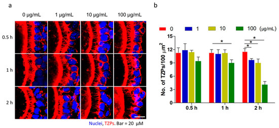 TZPs were observed in OGCs incubated with fullerenol (0, 1, 10, and 100 μg/mL) for different durations (0.5, 1, and 2 h). The confocal microscopy revealed intact and abundant TZPs, which mainly consisted of F-actin and were labeled with rhodamine phalloidine and were clearly visible as thin filaments connecting the granulosa cell layer and oocytes. After treatment, the number of TZPs was clearly reduced in a time- and dose-dependent manner (Figure 1a,b). Then, 2 h later, a few thin filaments from granulosa cells connecting oocyte were observed in the 100 μg/mL fullerenol group, but they were still intact and abundant in the control group. The number of TZPs was reduced in cells exposed to 1 and 10 μg/mL fullerenol nanoparticles. These results demonstrated that fullerenol accelerated TZP retraction from the oocytes.
