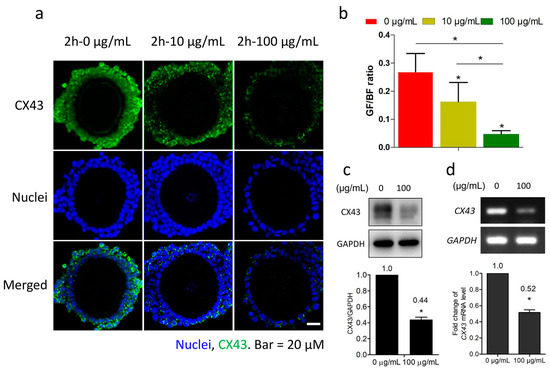 CX43 is one of the major connexins in connected granulosa cells. Following 2 h culture in M2 medium with fullerenol (10 and 100 μg/mL), antibody-labeled CX43 was visible in granulosa cells under a fluorescent confocal microscope. As shown in Figure 2a, the CX43 (green) intensity in peripheral granulosa cells of the OGCs was reduced in a dose-dependent manner. The relative fluorescent intensity analysis of labeled CX43 (green) and the nuclei (blue) revealed a significant difference between the compared groups, even the 10 μg/mL group (Figure 2b). The CX43 expression in granulosa cells treated with 100 μg/mL fullerenol was downregulated by approximately 56% according to the western blot analysis (Figure 2c). Furthermore, transcriptional levels of CX43 were also downregulated (Figure 2d).