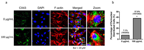 Fullerenol induces connexin 43 (CX43) perinuclear distribution. Freshly isolated granulosa cells were routinely cultured for 4 days for attachment and were then treated with 100 μg/mL fullerenol for 2 h. Cellular distribution of CX43 was evaluated. (a) Immunofluorescent analysis of CX43 (green, scale bar: 20 μm). Fullerenol treatment caused CX43 perinuclear distribution compared with the control group (indicated by white arrow). The white squares indicate the distinctive cells and are zoomed. Blue and red color indicate nuclear staining and F-actin skeleton, respectively; (b) Percentage of granulosa cells with CX43 perinuclear distribution; * indicates the test statistic was greater than the critical value when the two percentages were compared.