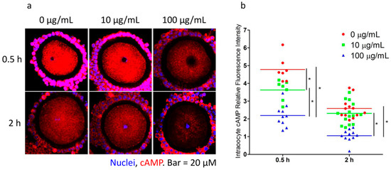 Immunofluorescent analysis of cyclic adenosine monophosphate (cAMP) in oocytes (red, scale bar: 20 μm). Oocyte-granulosa cell complexes (OGCs) were cultured in M2 medium with different concentrations of fullerenol (0, 10, and 100 μg/mL) for 0.5 and 2 h and then fixed. (a) Representative images of cAMP in OGCs; (b) Quantitative analysis of intraoocyte cAMP fluorescence intensity (n = 7–14 oocytes). Blue and red color indicate nuclei staining and cAMP, respectively. Experiment was performed three times with similar results; * p < 0.05 compared with the indicated groups.