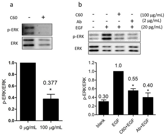 EGFR-mediated ERK1/2 activation is one of the regulatory mechanisms mediating CX43 expression [42]. Using western blot, we found that 2 h treatment with 100 μg/mL fullerenol significantly decreased the p-ERK1/2 level (presented as p-ERK in Figure 5), by approximately 62% in granulosa cells compared with the control (Figure 5a). Ligand binding to EGFR is an essential step for ERK1/2 activation. EGF, an EGFR ligand, efficiently activated ERK1/2 while binding of the anti-EGFR antibody to the extracellular domain of EGFR inhibited EGFR/ERK1/2 activation by occluding ligand binding [43]. Therefore, the antibody (Ab in Figure 5) against EGFR was selected as a positive control, and it significantly reduced p-ERK1/2 levels (Figure S3). Granulosa cells were pretreated with 100 μg/mL fullerenol or 2 μg/mL antibody for 2 h and then stimulated with EGF to activate EGFRs. Western blot showed a significant reduction in p-ERK1/2 levels in fullerenol- and antibody-pretreated granulosa cells compared with the untreated group (Figure 5b). Analysis of these results showed that fullerenol apparently also inhibited EGFR-mediated ERK1/2 phosphorylation by occluding the ligand-binding region (Figure 5b).