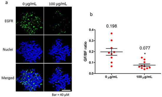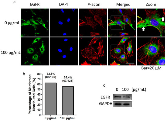 The effect of fullerenol on EGFR distribution was investigated further. We found that EGFR (green) was commonly distributed in the cytoplasm and membrane in granulosa cells (Figure 7a, 0 µg/mL row indicated with a white arrow) in the control group, but was mainly distributed in the perinuclear region in fullerenol-treated cells (Figure 7a, 100 µg/mL row). Further, we found that in the control group, the percentage of granulosa cells with EGFR membrane distribution was 62.5% (85/136) while that in the treated group was reduced to 55.4% (67/121, Figure 7b). The result indicates that fullerenol induced the variation of EGFR cellular distribution. Additionally, EGFR expression in granulosa cells was not significantly altered after 100 μg/mL fullerenol treatment for 2 h (Figure 7c).