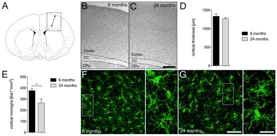 Age-dependent changes in cortical microglia. (A) Orientation scheme monitoring cortical areas for evaluation. Arrows mark the area for cortical thickness measurements. Representative images of Iba1+ microglia in cortices from 6-month-old (B) and 24-month-old mice (C). Scale bar represents 300 µm. Quantifications of cortical thickness (D) and cortical Iba1+ microglia numbers (E) are shown. Data are given as means ± SEM from three animals per age. p-value derived from Student’s t-test is * p < 0.05. Differences in morphology and distribution of Iba1+ microglia between 6-month-old (F) and 24-month-old (G) mice. Scale bars indicate 20 µm in overview images and 7 µm in high magnification detail images. CC = corpus callsosum, CPu = caudatoputamen.