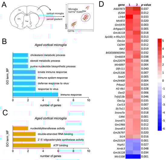 Gene expression pattern of aged cortical microglia. (A) Workflow scheme depicting microglia isolation and sorting strategy. (B,C) GO term enrichment analysis of biological processes (B) and molecular functions (C) as performed using DAVID Bioinformatics Resources 6.8. (D) Heatmap summarizing transcriptional changes in aged cortical microglia. Expression data from aged microglia are presented as log2-fold changes (n = 2) and compared to young (6-month-old) microglia. CC = corpus callosum, CPu = caudatoputamen, Ctx = cortex, Thal = thalamus.