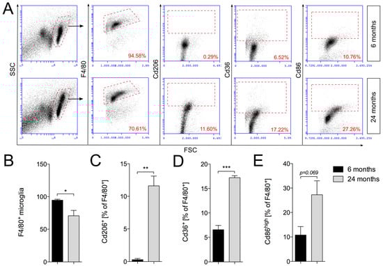 Using flow cytometry, the expression of microglia activation markers Cd206, Cd36 and Cd86 was determined. Cortical microglia were isolated using the percoll gradient method and subsequently stained against F4/80 as a microglia marker in combination with either Cd206, Cd36 or Cd86. Flow cytometry revealed that total numbers of F4/80+ cortical microglia were significantly reduced in aged mice (Figure 3A,B), which confirms microglia quantifications depicted in Figure 1E. Moreover, we observed significant increases in Cd206+ (Figure 3A,C), as well as Cd36+ (Figure 3A,D) microglia. As given in Figure 3E, quantifications of F4/80+/Cd86+ microglia revealed that the percentages of Cd86high microglia increase in the frontal cortices of aged mice; however, this increase did not reach statistical significance (p = 0.069). The results presented here demonstrate that aged cortical microglia display an activation pattern characterized by increased expression of M1-like as well as M2-like microglia activation markers. Based on the percentages of marker-positive microglia, it is highly likely that distinct cortical microglia subsets with specialized functions exist in aged mice. It further remains to be established to what extent these subsets contribute to anti-inflammatory and restorative functions in the aged cerebral cortex.