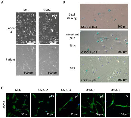 Microscopic observation of primary cell lines derived from bone marrow (MSC) or OS samples (OSDC) on treated culture dishes. Representative images are shown for MSC and OSDC at indicated passages (p). (A) Optical microscopy observation of adherent cells in standard culture conditions; (B) Optical microscopy observation of X-gal staining (upper panel, senescent cells have blue cytoplasmic color) and quantification of senescent cells (middle and bottom panels). Quantification was performed on 50 nuclei identified by two associated nucleoli using ImageJ. Non-senescent cells and senescent cells are shown with dark or light blue points, respectively; (C) Optical fluorescent microscopy immunodetection of alpha-smooth muscle actin (ASMA) (green), with nuclei colored in blue.
