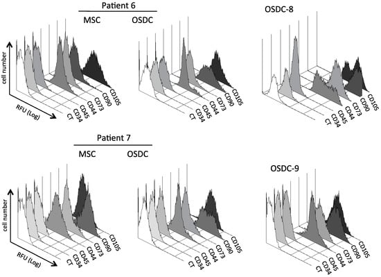 Histograms of relative fluorescent unites (RFU) for cluster of differentiation (CD) antigens on primary cell lines derived from OS samples (OSDC) or bone marrow (MSC) obtained from patients 6–9. RFU identified as CT were acquired with the control isotype (IgG-PE). MSC from patient 8 and 9 were not available. Colors are used to simplify reading.