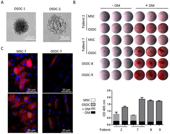 Sphere clone development from OSDC-2 was observed only with bFGF, whereas no sphere was detected without bFGF in the semi-solid medium (Supplementary Figure S1; Figure 3A). Following these observations, bFGF was always added during the sphere assays. In these conditions, all OSDC except OSDC-3, formed sphere clones, with a 67 × 10−7 to 65 × 10−5 ranging rate (Table 2). Three patient-corresponding MSC did not form sphere clones. All OSDC, excluding OSDC-3, formed sphere clones with a higher frequency than patient-corresponding MSC. When osteogenic and adipogenic commitment of OSDC and MSC were compared, as shown in Figure 3B, osteogenically induced OSDC produced a calcium-containing matrix which was more intensely stained with alizarin red compared to patient-corresponding MSC in osteogenic induction medium. Quantification of bound alizarin red staining showed a 2-fold increase in absorbance in osteogenically differentiated-MSC compared to undifferentiated-MSC culture, while a 5- to 7-fold increase was observed for osteogenically differentiated-OSDC compared to undifferentiated-OSDC cultures. In contrast, adipocyte commitment was more efficient for MSC than for OSDC. As shown in representative images in Figure 3C, following adipogenic differentiation of MSC, more than 50% of cells differentiated into adipocytes, as detected with Nile Red lipid staining, whereas less than 30% of OSDC differentiated toward the adipogenic lineage after adipogenic induction.