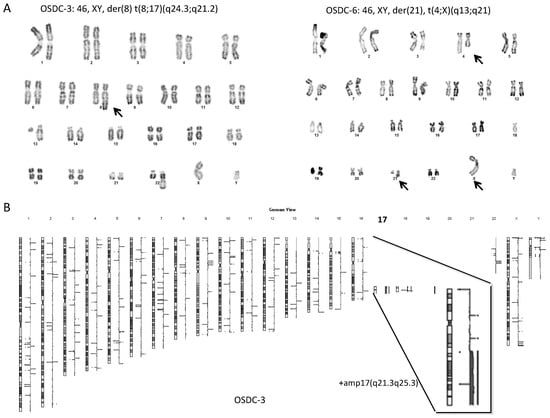 Genomic DNAs were extracted from primary cell lines, MSC, and OSDC using standard protocols. Array comparative genomic hybridization (aCGH) experiments were performed by using Agilent Human Genome CGH 400K oligonucleotide arrays or 60K oligonucleotide arrays with the ISCA design (Agilent, Santa Clara, CA, USA; Available online: www.agilent.com) following the protocols provided by Agilent. Arrays were scanned with G2565CA Microarray Scanner System and analyzed with CytoGenomics v3.0.6.6 (Agilent Technologies, Santa Clara, CA, USA).