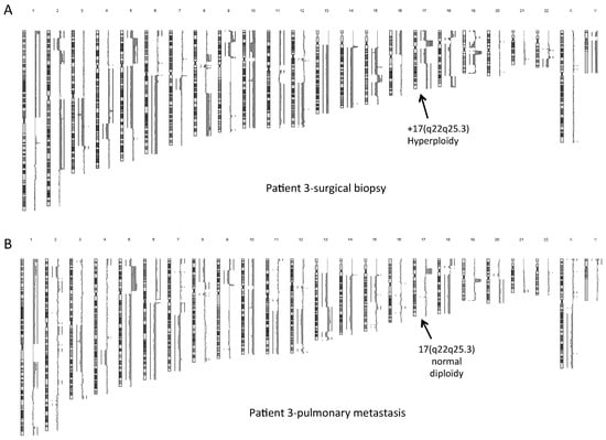 Complex chromosomal rearrangements on tumor samples of patient 3. Analysis of array comparative genomic hybridization on DNA from patient-3, of (A) the OS biopsy before poly-chemotherapy and (B) of pulmonary metastasis 18 months after the initial treatment. Black arrows show the 17(q22q25.3) hyperploidy that is found in the biopsy sample but not in the metastasis sample.