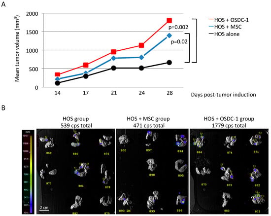 Co-injection of OS-inducing cells (MNNG-HOS cells (HOS)) with OSDC-1 in athymic mouse. (A) Mean tumor volumes are presented for three groups of mice (n = 8) injected with 1 million MNNG-HOS cells either alone, or with 0.5 million of MSC or OSDC-1. Significant differences between the MNNG-HOS and the MNNG-HOS + MSC/OSDC-1 groups are indicated. Differences were significant when p <0.05. Individual tumor volumes are represented as dots and mean tumor volumes in supplementary Figure S3; (B) Images of in vivo bioluminescence detection are shown for excised lung lobes. Luciferase-activity was detected at day 28 after cell injections for each group. Counts per second (cps) of selected areas with value above background were added together as cps total.