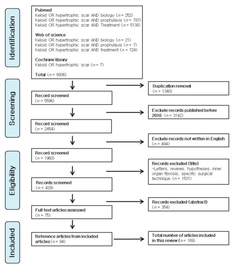 The original articles dealing with the biology, prophylaxis and treatment strategies for hypertrophic scars and keloids were searched and reviewed. PubMed, Web of Science and Cochrane library databases were searched on the keywords: hypertrophic scar OR keloid AND biology; hypertrophic scar OR keloid AND prophylaxis; hypertrophic scar OR keloid AND treatment. Time limits were from 1 January 2010 to the present. In addition, important reference articles from the included articles were also reviewed. Several meta-analysis were also reviewed to estimate the outcome of a certain treatment modality. Duplicates, letters, reviews, hypotheses articles dealing with the fibrotic disorders on internal organs, studies dealing with specific surgical techniques and studies published in a language other than English were excluded. Figure 1 shows the flowchart of the literature search for this review.