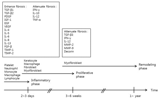 Prolonged and excessive inflammatory reactions result within the context of increased fibroblast activity, which in turn produces excessive ECM. In this phase, degranulation of platelets releases and activates transforming growth factor β (TGF-β), particularly TGF-β1, TGF-β2, platelet-derived growth factor (PDGF), insulin-like growth factor (IGF-1) and epidermal growth factor (EGF). Vascular endothelial growth factor (VEGF), which is produced by epidermal cells, is a positive regulator of angiogenesis. Because of this, overexpression of VEGF is related to excessive capillary formation, collagen type I production and overall scar volume increase [9]. These cytokines are not only fibrogenic growth factors, but also chemotactic agents for epithelial cells, endothelial cells, neutrophils, macrophages, mast cells and fibroblasts [4,8]. Fibroblasts originating in keloid tissues show increased receptors to these growth factors and demonstrate increased responsiveness compared with fibroblasts from normal tissues [10,11,12,13]. Tissue inhibitors of metalloproteinases (TIMPs) are endogenous inhibitors of matrix metalloproteinases (MMPs); thus, increased levels of TIMPs, especially TIMP-1 and TIMP-2, are associated with hypertrophic scar formation [9]. Tumor necrosis factor-α (TNF-α) is an inflammatory cytokine produced by monocytes and macrophages during the inflammatory phase. It has been known that this cytokine induces collagen degranulation and contributes to minimizing excessive scarring. One suggested mechanism is that TNF-α increases the MMP1/TIMP3, MMP2/TIMP3 ratios [14]. However, other studies showed that the biologic effect of TNF-α was not the same on the fibroblasts from lung and skin tissues showing tissue specificity [15] and TNF-α induced epithelial-mesenchymal transition in human skin wound healing [16]. Therefore, it is still unclear whether TNF-α would promote or attenuate scar formation.