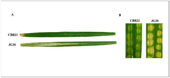 Reaction patterns of CBB23 and JG30 leaves to Xoo strain PXO99A. (A) Comparison of CBB23 and JG30 leaves after inoculation of PXO99A strain by scissors-dipped method. Photographs were taken 14 days post inoculation; (B) Inoculation of PXO99A strain into CBB23 and JG30 leaves with a needleless syringe. Photographs were taken 4 days post inoculation.