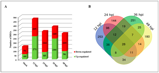 Differentially expressed genes retrieved from CBB23 compared to JG30 at different time of intervals. (A) Overall, 1645 DEGs were perceived in CBB23 compared to JG30 at different time of intervals after PXO99A infection; (B) Venn diagram illustrating the differentially expressed genes at 4 different times of interval after PXO99A infection in CBB23 compared with JG30. A set of 476, 329, 384, and 305 DEGs were identified at 12 hpi, 24 hpi, 36 hpi, and 48 hpi, respectively.