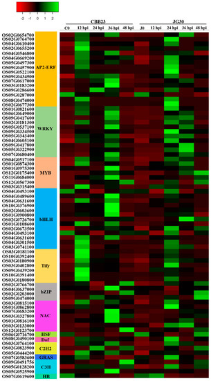 Transcription factors appear to be involved in the regulation of different physiological programs in response to plant–pathogen interaction [22]. We identified 75 putative transcription factors that could be classified into 13 different TF families (Figure 3 and Table S3). These 75 differentially expressed TFs might perform an important role in the rice–PXO99A interaction. Among differentially expressed TFs, only 3 WRKY TFs (Os09G0417600, Os09G0417800, and Os05G0322900) were upregulated in C0 vs. J0; whereas, nine APETALA2/ethylene responsive factor (AP2-ERF), seven WRKY, two MYB, three bHLH, and seven Tify TFs were upregulated in CBB23 relative to JG30 at 12 hpi. At 24 hpi, eight AP2-ERF, six WRKY, five bHLH, and five Tify were the major downregulated TFs; however, only one C2H2 TF was upregulated in CBB23 compared to JG30 at 24 hpi. At 36 hpi, five AP2-ERF, seven bHLH, and three NAC TFs were the major genes that had high expression patterns in CBB23 relative to JG30. Moreover, one C3H and one NAC TFs were upregulated in CBB23 compared to JG30 at 48 hpi. Briefly, 47 TF responsive genes were upregulated and 28 were downregulated in CBB23 relative to JG30. Thus, upregulated genes may be involved in enhancing the immunity of CBB23 against PXO99A infection. Nevertheless, downregulated genes may be negatively regulating the rice immunity upon PXO99A infection.