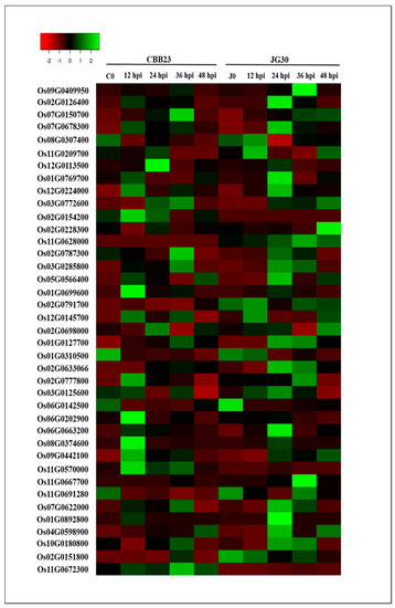 Kinases play a crucial role in signaling during pathogen recognition and subsequent activation of the plant defense mechanism to counter the pathogen attack. In our experiments, we identified 39 differentially expressed kinase responsive genes at different time points before and after the PXO99A infection (Figure 4). Among the 39 kinase responsive genes, expressions of 13 genes were upregulated, and 26 were downregulated in CBB23 relative to JG30 after PXO99A infection (Table S4). In mock samples (C0 vs. J0), expression of three genes (Os11G0628000, Os02G0151800, and Os02G0791700) were downregulated, and only one gene (Os11G0672300) was upregulated. At 12 hpi, 23 DEGs (13 upregulated and 10 downregulated) were identified. Among the 13 upregulated DEGs, including three receptor like kinases (RLKs) (Os09G0442100, Os08G0374600, and Os11G0570000), 3 serine/threonine protein kinase (Os01G0699600, Os06G0202900, and Os07G0622000), 2 mitogen-activated protein kinase (MAPK) (Os03G0285800, Os05G0566400), one calcium-dependent protein kinase (Os02G0126400), one phytosulfokine receptor (PSK) (Os02G0154200), one ankyrin-kinase (Os01G0892800), one CBL-interacting protein kinase (Os07G0678300), and one kinase responsive protein (Os11G0672300), all exhibited positive regulation in CBB23 genotype compared to the JG30 genotype. At 24 hpi, 20 DEGs (3 upregulated and 17 downregulated) were identified. Among the 20 DEGs, three differentially expressed kinase responsive genes, including one CBL-interacting protein kinase (Os12G0113500), one phosphatidylinositol 3-kinase (Os08G0307400), and one kinase responsive protein (Os11G0672300), were upregulated in CBB23 than in JG30. Differentially expressed kinase responsive genes with seven downregulated genes at 36 hpi; however, one DEG belong to the MAPK (Os02G0787300), one kinase responsive protein (Os11G0672300), respectively, were upregulated in CBB23 relative to JG30. At 48 hpi, eight DEGs were identified, and the expression of one kinase responsive protein (Os11G0672300) was upregulated, and the other seven genes were downregulated in CBB23 vs. JG30 after PXO99A infection.