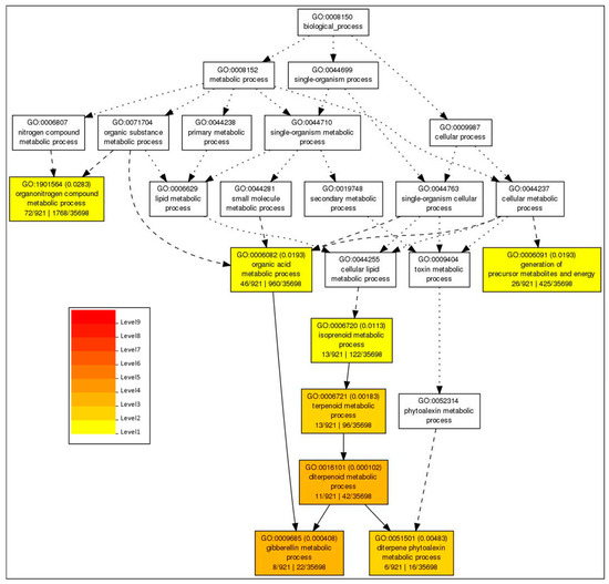 To identify which biological process was differentially regulated after PXO99A inoculation, the GO analysis for the classification of 12 hpi, 24 hpi, 36 hpi, and 48 hpi DEGs was performed (Figure 5). The GO terms revealing the biological process were as follows: “organonitrogen compound metabolic process” (GO:1901564), “organic acid metabolic process” (GO:0006082), “generation of precursor metabolites and energy” (GO:0006091), “isoprenoid metabolic process” (GO:0006720), “terpenoid metabolic process” (GO:0006721), “diterpenoid metabolic process” (GO:0016101), “gibberellin metabolic process” (GO:0009685), and “diterpene phytoalexin metabolic process” (GO:0051501).