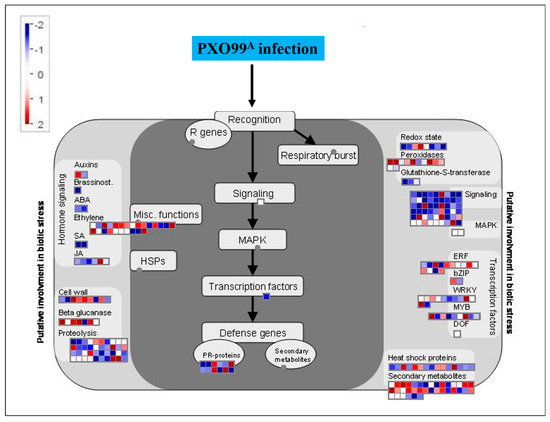 Fourteen of 25 DEGs encoding ethylene (ET) were upregulated, and five DEGs associated with cell wall were upregulated. In addition, five of seven DEGs were upregulated in beta-glucanase, and 13 DEGs encoding proteolysis were upregulated. The detailed list of all the DEGs involved in rice–PXO99A interaction in MapMan functional categories was pointed out in Table S7.
