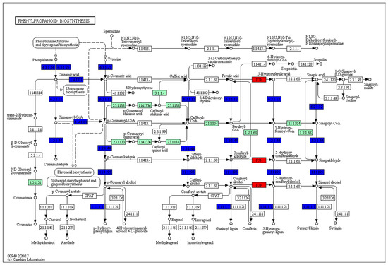 Putative phenylpropanoid biosynthesis pathway was constructed based on the log2FC value of DEGs. The number in boxes represents the enzymes coding. The different color schemes were given to the boxes: blue and red colors depict the up- and downregulated genes, respectively.