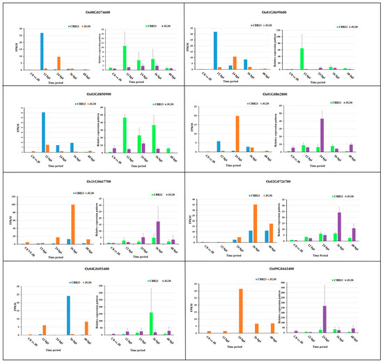 Eight DEGs genes influenced by PXO99A between CBB23 and JG30 were selected for qRT-PCR to validate the RNA-Seq data (Figure 8). Among the eight selected genes, Os08G0374600 (receptor kinase CRINKLY4) and Os01G0699600 (serine/threonine protein kinase) were highly expressed at 12 hpi in CBB23 than JG30. Os03G0850900 encoding another kinase exhibited continuous high expression patterns from 12 to 36 hpi in CBB23 compared with JG30. Os01G0862800, responsible for OsNAC59, showed a higher expression pattern at 24 hpi in JG30 than CBB23; hence, OsNAC59 was identified to be important for susceptibility. Os11G0667700 was identified as a kinase responsive gene, and exhibited high expression level in JG30 compared with CBB23 at 36 hpi. OsbHLH34 (Os02G0726700) was upregulated at 36 hpi and 48 hpi in JG30 compared to CBB23. Os04G0493400 encoding a pathogenesis-related protein (PR) expressed more highly in CBB23 than JG30 at 36 hpi. Os09G0443400 encoding a hypothetical protein exhibited significantly higher expression level at 24 hpi in JG30 than CBB23. In short, the expression pattern of DEGs by qRT-PCR validates the results revealed by RNA-Seq analysis.