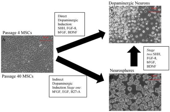 Mesenchymal stem cells (MSCs) have been identified as a potential candidate for use in regenerative medicine. MSCs can be isolated from a variety of sources, are easily expandable in culture, and exhibit immunomodulatory properties in vivo, making them ideal for cell transplantation studies [,,,,,]. Additionally, MSCs have been shown to aid in neural repair through the secretion of cytokines and neurotrophic factors [,,,] and may also hold the potential to transdifferentiate into cells of ectodermal origin, such as neural stem cells, neurons [,,,,,,,,,,,], and more specifically, dopaminergic neurons [,,,,,,,,,]. Still, there are several concerns surrounding this area of research, including the optimal method for generating dopaminergic neurons from MSCs and the optimal time, in terms of passage number, to initiate neuronal differentiation of MSCs.