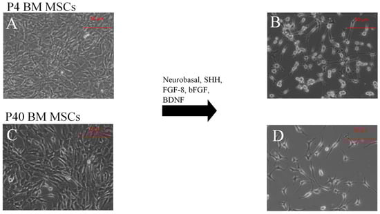 At the beginning of induction, both P4 and P40 MSCs cultures phenotypically consisted of a relatively homogeneous population of cells. Morphologically, cells exhibited large, thin flattened cell bodies, with large nuclei (Figure 2A,C). MSCs that underwent the DDI showed a change in morphology at 48–72 h following treatment with SHH, FGF-8, and basic fibroblast growth factor (bFGF). At this time, both populations of MSCs exhibited spherical refractile cell bodies, with dendritic-like processes, and long thin axonal-like projections from the cell soma, typical of neurons (Figure 2B,D). The MSCs retained this morphology for the duration of the induction.