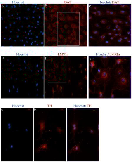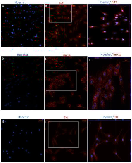 Immunocytochemistry/immunofluorescence (ICC/IF) performed on P4 MSCs following the DDI. Hoechst-labeled P4 MSCs (A,D,G) revealed positive staining of the mature dopaminergic markers DAT ((B) red) and TH ((H) red), and the immature dopaminergic marker LMX1a ((E) red), following exposure to SHH, FGF-8, bFGF, and BDNF. Orthogonal displays of z-stacks are represented in merged images (C,F,I).