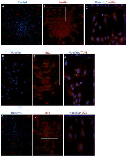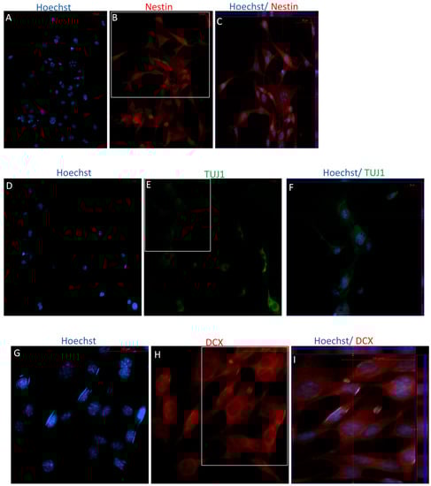 Immunocytochemistry/immunofluorescence (ICC/IF) performed on P40 following Stage One of the IDI. Following exposure to bFGF and EGF, cells revealed positive staining of the immature neuronal markers in P4 cells, including Nestin ((B) red), TUJ1 ((E) red), and DCX ((H) red). Hoechst-labeled P40 NSCs (A,D,G). Orthogonal displays of z-stacks are represented in merged images (C,F,I).