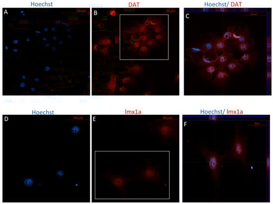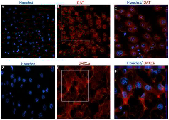 Immunocytochemistry/immunofluorescence (ICC/IF) performed on P40 MSCs following Stage Two of the IDI. Hoechst-labeled P40 MSCs (A,D) the mature dopaminergic marker, DAT ((B) red), and the immature dopaminergic marker, LMX1a ((E) red), following exposure to SHH, FGF-8, and BDNF (right). There was no bright staining detected for TH for P40 differentiated cells (image not included). Orthogonal displays of z-stacks are represented in merged images (C,F).