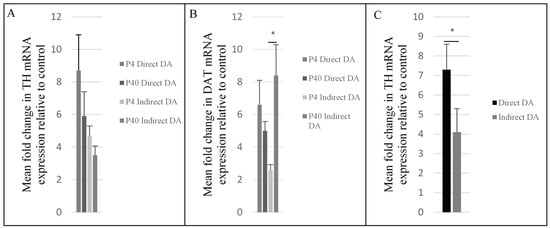 Results from qRT-PCR analyses. (A) TH mRNA expression relative to control was not significant. (B) DAT mRNA expression relative to control MSCs P40 MSCs exhibited a significant increase in DAT mRNA expression following the IDI as compared to P4 MSCs following the IDI (C) MSCs exhibited significantly higher mean fold changes in TH mRNA expression following the DDI as compared to the IDI. Results are presented as mean fold change in mRNA expression ± SEM; * p = 0.05.