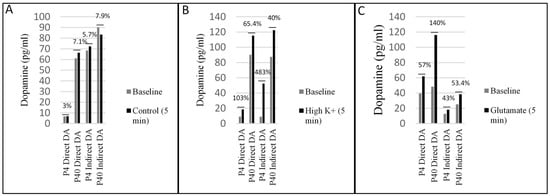 A dopamine ELISA was used to determine if early and later passaged MSCs secrete dopamine following either the DDI or IDI (Figure 12). Samples were collected from three individual wells at baseline from P4 and P40 control MSCs, and P4 and P40 MSCs, following the DDI and IDI. Following baseline collections, MSCs were treated with elevated KCl and glutamate (one well remained untreated to be used as a control) and incubated for 5 min prior to sample collection []. Baseline collections from early and later passaged MSCs demonstrated that MSCs spontaneously release dopamine following both the direct and indirect dopaminergic inductions (Figure 12). Levels of dopamine release were increased following treatment with elevated KCl (Figure 12B) and glutamate (Figure 12C), while control levels remained relatively unchanged (Figure 12A). Although dopamine release was observed before stimulation, the increase in dopamine following treatment with KCl and glutamate suggests that these cells release dopamine in a depolarization-dependent manner. Early and later passaged control MSCs did not release dopamine in any detectable levels.