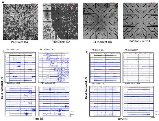 Multi-electrode recordings from early and later passaged MSCs following the DDI and IDI. (A) Images of P4 and P40 differentiated MSCs and surrounding electrodes (black dots). (B) Recordings of P4 and P40 MSCs following the DDI and IDI. At 2–3 weeks following differentiation, MSCs exhibit spontaneous neuronal activity. (C) Neuronal activity is reduced in all groups following addition of TTX to the MEA well at a final concentration of 1 µM. Samples were recorded for 10 min (600 s). TTX was added to culture media at ~300 s.