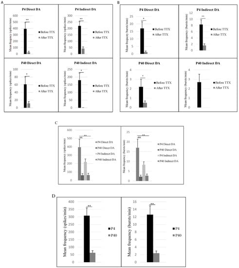 Spiking and bursting activity across all electrodes. (A) Spiking frequencies were significantly reduced in all four treatment groups following addition of TTX. (B) Bursting frequencies were significantly reduced in P4 MSCs following the direct and indirect inductions, and in P40 MSCs following the DDI. No bursting activity was detected following addition of 1 µM TTX to the MEA well for P40 MSCs following the IDI. (C) P4 MSCs exhibited a significant increase in spiking and bursting frequencies following the DDI, as compared to P40 MSCs following both the DDI and IDI. (D) P4 MSCs exhibited an increase in spikes and bursts per minute as compared to P40 MSCs following either the DDI or IDI. Results are presented as mean frequencies (spikes or bursts per minute) ± SEM; * p < 0.05, ** p < 0.001.