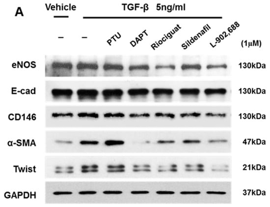 EndMT is involved in cardiac fibrosis, and is a multifaceted process whereby endothelial cells adopt a mesenchymal phenotype and overexpress mesenchymal cell markers such as α-SMA and Twist [,]. The endocardial layer may contribute to ventricular fibrosis via EndMT to cause RV hypertrophy in the MCT-PAH rat model. TGF-β signaling has been shown to play an important role in EndMT [,]. In fact, adding TGF-β to epithelial cells in culture is a convenient way to induce EndMT in various epithelial cells []. Therefore, we utilized cultured human umbilical vein endothelial cells (HUVECs) to test the suppressive effect of preclinical and clinical PAH drug candidates such as propylthiouracil (PTU) (Sigma, Saint Louis, MO, USA) [], N-[N-(3,5-difluorophenacetyl)-l-alanyl]-S-phenylglycine t-butyl ester (DAPT, a γ-secretase inhibitor; Calbiochem, La Jolla, CA, USA) [], riociguat (Cayman Chemical, Ann Arbor, MI, USA) [], sildenafil (Cayman Chemical) [], and L-902,688 (Cayman Chemical) at 1 µM against 5 ng/mL TGF-β-induced EndMT. Western blot analysis of endothelial cell marker (eNOS, E-cadherin, and CD146) and mesenchymal and EndMT marker (Twist and α-SMA) on TGF-β1-induced EndMT (Figure 1A) expression showed that α-SMA and Twist expression levels were strongly decreased by treatment with 1 µM L-902,688 (Figure 1B). Taken together, these data suggest that the inhibitory effect of the EP4 agonist L-902,688 on RV fibrosis might be mediated by suppression of α-SMA and Twist, the EndMT markers.