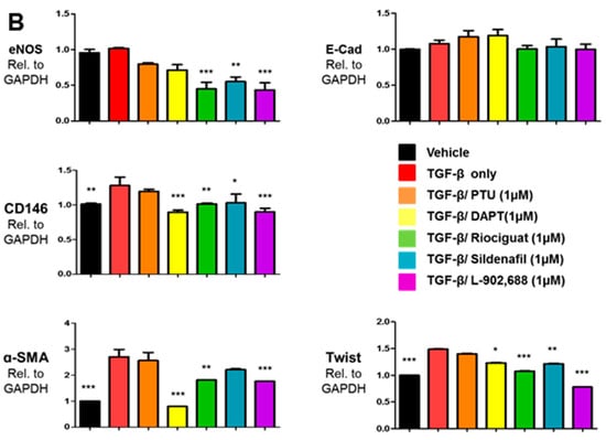 Effect of pulmonary arterial hypertension (PAH) drug candidates on endothelial cell markers and mesenchymal cell markers in cultured endothelial cells. (A) Representative immunoblot and (B) densitometric quantification of Western blot shows the expression levels of endothelial cell markers eNOS, E-cadherin (E-cad) and CD146, and mesenchymal cell markers Twist and α-smooth muscle actin (α-SMA) in whole cell extract. Human umbilical vein endothelial cells (HUVECs) were treated under the indicated conditions for 24 h. The relative expression level of each protein was quantified by densitometry and normalized to GAPDH. Each value represents the mean ± SE of three independent experiments. * p < 0.05, ** p < 0.01, and *** p < 0.001 versus the TGF-β1-only group (the red bar) by one-way ANOVA with Bonferroni’s post-test.