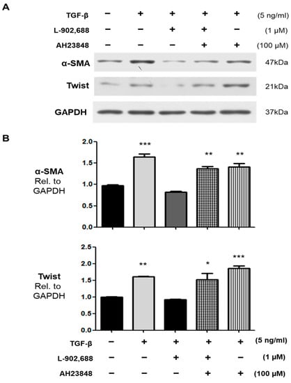 The EP4 inhibitor AH23848 blocks the L-902,688-induced suppression of TGF-β-induced EndMT in HUVEC. TGF-β-induced expression of the EndMT markers α-SMA and Twist in endothelial cells was suppressed by L-902,688. The endothelial cells were stimulated for 30 min with 100 µM AH23848 with or without L-902,688 or TGF-β for 24 h. Data are the mean ± SE of three different experiments. * p < 0.05, ** p <0.01, and *** p < 0.001 versus untreated group. (A) Representative immunoblots showing that the suppression of TGF-β-induced expression of α-SMA and Twist by 1 µM L-902,688 was reversed with an EP4 inhibitor (AH23848) at 100 µM. (B) Densitometry quantification of α-SMA and Twist expression following EP4 inhibitor treatment in endothelial cells.