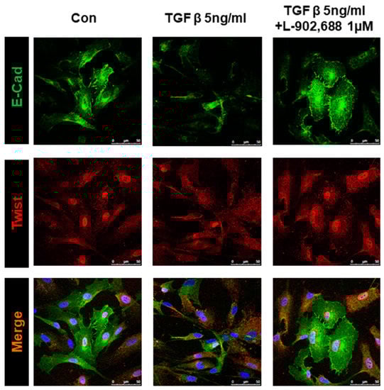 Effect of L-902,688 on TGF-β-induced Twist expression in HUVEC. After 24 h of serum deprivation, endothelial cells were treated under the indicated conditions for 24 h. Immunocytochemistry shows the localization of Twist (red) and E-cadherin (E-cad) (green) expression (nuclear staining with DAPI in blue; scale bar: 50 µm). The images are a representative of three independent experiments.