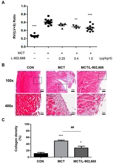 EP4-specific agonist L-902,688 (1 µg/kg/day) in the MCT-induced PAH rat was shown to reduce the RV hypertrophy []. The next experiment was designed to evaluate whether the inhibitory effect of L-902,688 on EndMT in vitro could attenuate RV changes in vivo. The efficacy of L-902,688 (0.25, 0.4 and 1 µg/kg/day) and changes in RV structure was evaluated in an MCT-induced PAH rat model. As expected, rats challenged with MCT developed RV hypertrophy—as indicated by an increased weight of the right ventricle (RV) divided by weight of the left ventricle (LV) plus septum (S) (RV/(LV + S) weight ratio)—on the 28th day after MCT injection compared with controls (Figure 4A). Administration of L-902,688 from the 8th to the 28th day after MCT injection decreased the RV/(LV + S) weight ratio (Figure 4A) in MCT-induced PAH rats. The histological analysis of trichrome-stained RV tissue demonstrated a striking difference in the amount of collagen deposition between the L-902,688 and MCT groups (Figure 4B). Quantification of the collagen (shown in blue) area compared to the total tissue area demonstrated a significant difference between the two groups (Figure 4C).