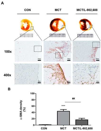 Histological analysis of the mesenchymal cell marker α-SMA in right ventricular (RV) tissue. (A) Cardiac morphology in cardiac cross-sections and histological analysis of α-SMA expression in RV tissue demonstrated that endocardial α-SMA (brown) expression was significantly higher in MCT rats at Week 4 than in control (CON) rats. However, 3 weeks of EP4 agonist 1 µg/kg/day (MCT/L-902,688) treatment significantly reduced α-SMA (brown) expression. In the top panel, scale bars = 100 μm; in the bottom panel, scale bars = 25 μm. (B) Quantitative analysis of α-SMA (brown) expression by a color deconvolution method demonstrated a significant reduction in the percentage of α-SMA (brown) among the total tissue area. Bars represent the mean ± SE (n = 5 per group); *** p < 0.001 versus CON; ## p < 0.01 versus the MCT group.