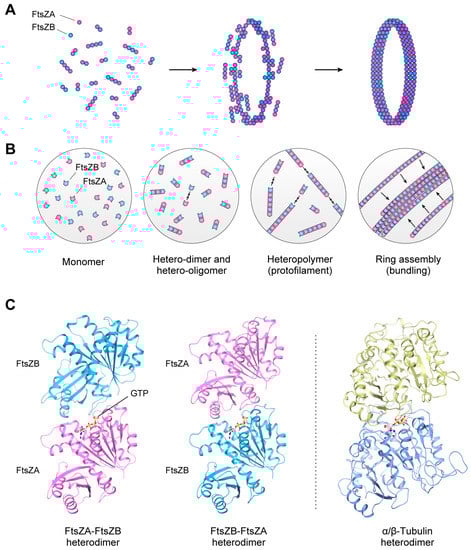 - Löwe, J.; Amos, L.A. Crystal structure of the bacterial cell-division protein FtsZ. Nature 1998, 391, 203–206. [Google Scholar] [CrossRef]