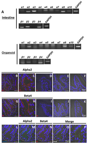 Localization of nAChR subunits in the mouse small intestine and organoids. (A) RT-PCR analysis of the expression of nAChR subunits in intestine and cultured organoids (passage 5); (B,D) visualization of α2 (red) in crypts and villus; (E,F) control sections labeled with secondary antibody [Alexa Fluor 546 donkey anti-(rabbit IgG)] in the absence of primary antibody; (G,I) visualization of β4 (red) in crypts and villus; (J,K) control sections labeled with secondary antibody [Alexa Fluor 568 rabbit anti-(goat IgG)] in the absence of primary antibody; (L–O) co-localization of α2 and β4 in crypts; (M) visualization of α2 (green) in crypts; (N) visualization of β4 (red) in crypts; (O) merged visualization of (L), (M), and (N). (C,H,P) Enlargement of (B), (G), and (O). White dotted lines indicate the crypt region. In all panels, nuclei were stained with Hoechst 33342 (blue). Bars in (B–P) except for (C), (H), and (P) represent 20 μm.