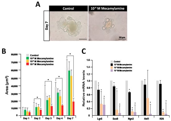 nAChRs were recently implicated in the control of the growth and proliferation of mouse embryonic stem cells (ESCs) and induced pluripotent stem (iPS) cells [24,25]. As we only detected a mild effect of nicotine on organoid growth, we next examined the effect of mecamylamine, a nicotinic receptor antagonist, on cultured organoids [23]. Organoid growth was dramatically inhibited by treatment with 10−4 M mecamylamine compared with controls at day 7 (Figure 2A). Except for day 1, there was a statistically significant dose-dependent inhibition of organoid growth until day 7 (Figure 2B). Next, using quantitative RT-PCR we compared the expression levels of selected marker genes (Lgr5 for ISC, Sox9 for Paneth cell, Ngn3 for enteroendocrine cell, Hnf1 for enterocyte, and Klf4 for goblet cell) in untreated organoids and those treated with mecamylamine for seven days. These analyses revealed that the levels of all marker gene transcripts were significantly downregulated compared with the untreated control (Figure 2C). The results indicate that nAChR signaling is involved in organoid growth and differentiation.