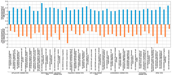 Classification of genes upregulated in response to nicotine and downregulated in response to mecamylamine. Bio-process gene ontology (GO) terms of the differentially expressed genes were mapped by DAVID analysis. Bar graphs show the Fold enrichment score output from DAVID analysis. The blue bar and upper axis indicate fold-enrichment scores for upregulated genes with nicotine and the orange bar and lower axis indicate fold enrichment scores for downregulated genes with mecamylamine.
